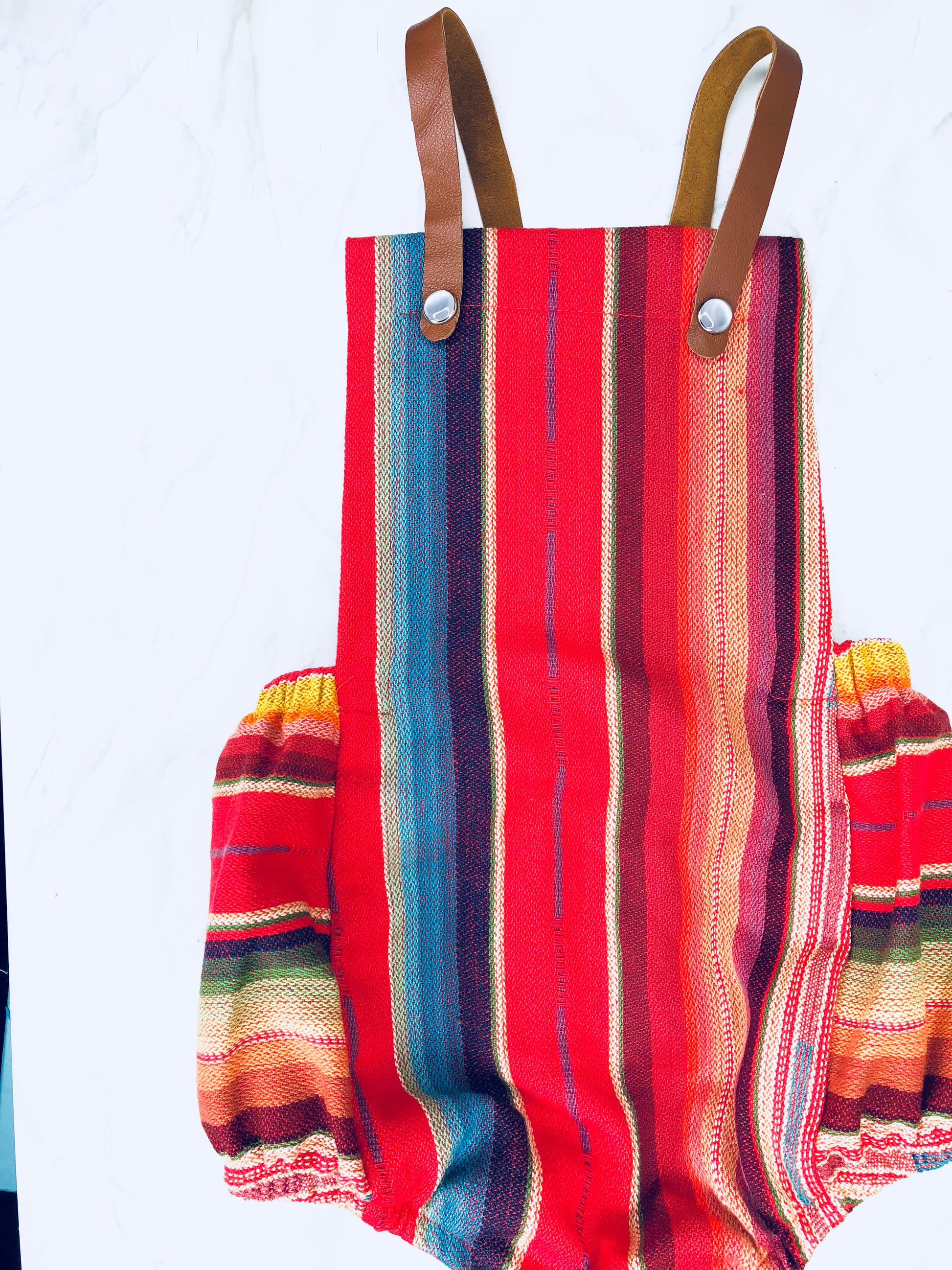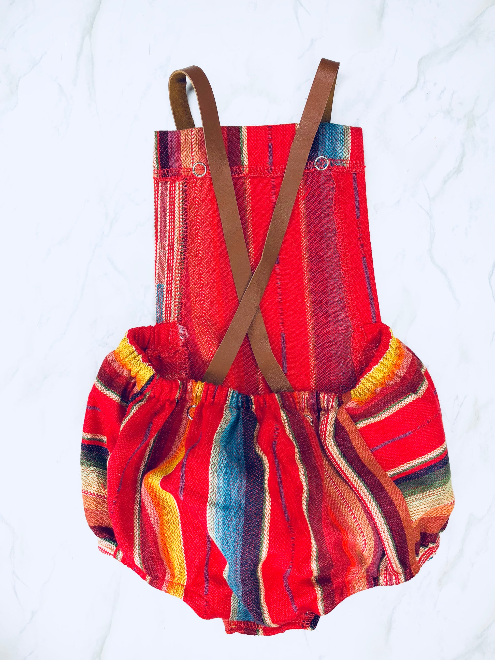 Comfortable and cute serape baby romper! Made of authentic Mexican Serape Fabric. Features leather straps, snap button closures for an easy diaper change and strap snaps for easy washing removal.